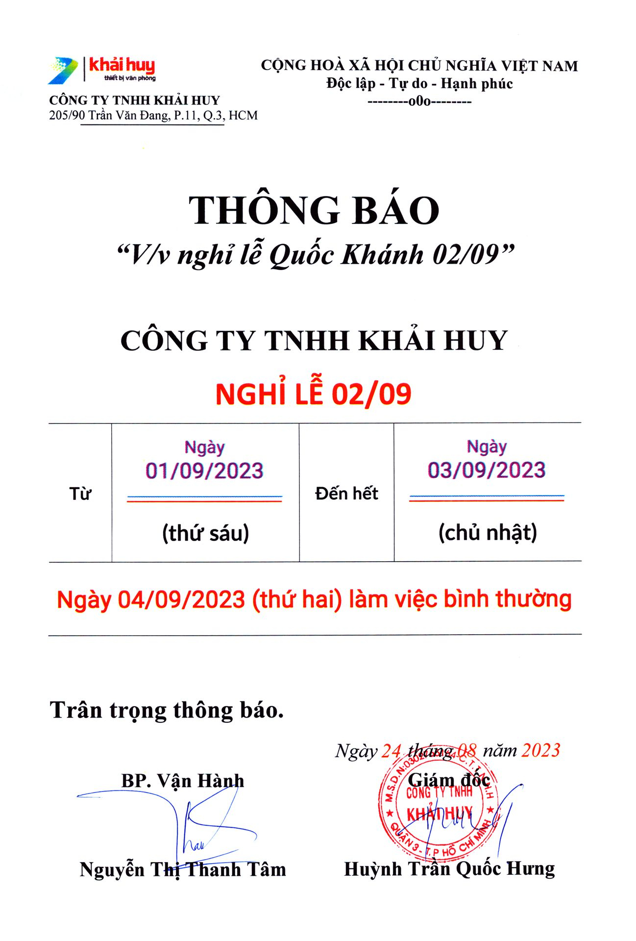 THÔNG BÁO LỊCH NGHỈ LỄ 02-09