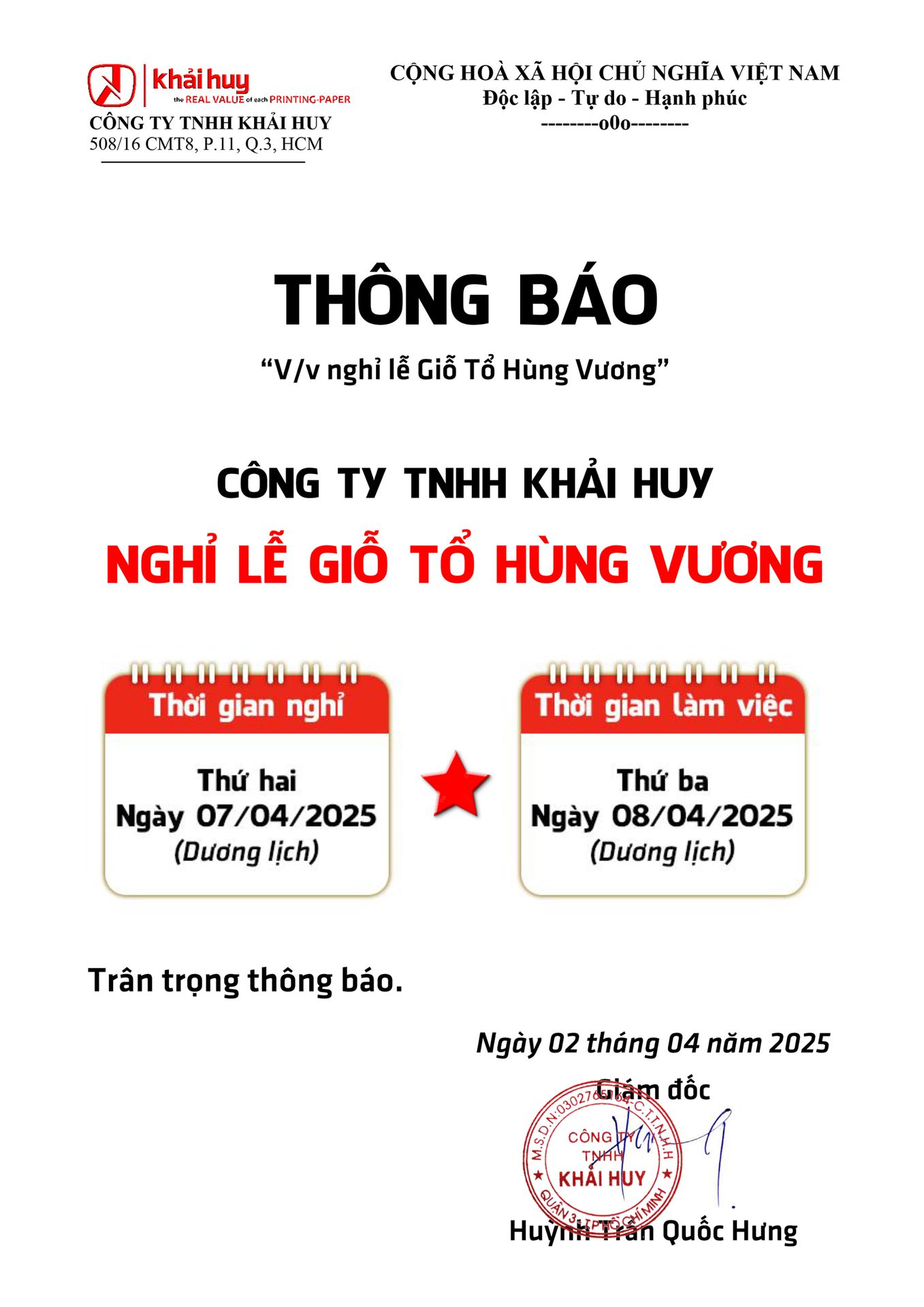 THÔNG BÁO NGHỈ LỄ GIỖ TỔ HÙNG VƯƠNG