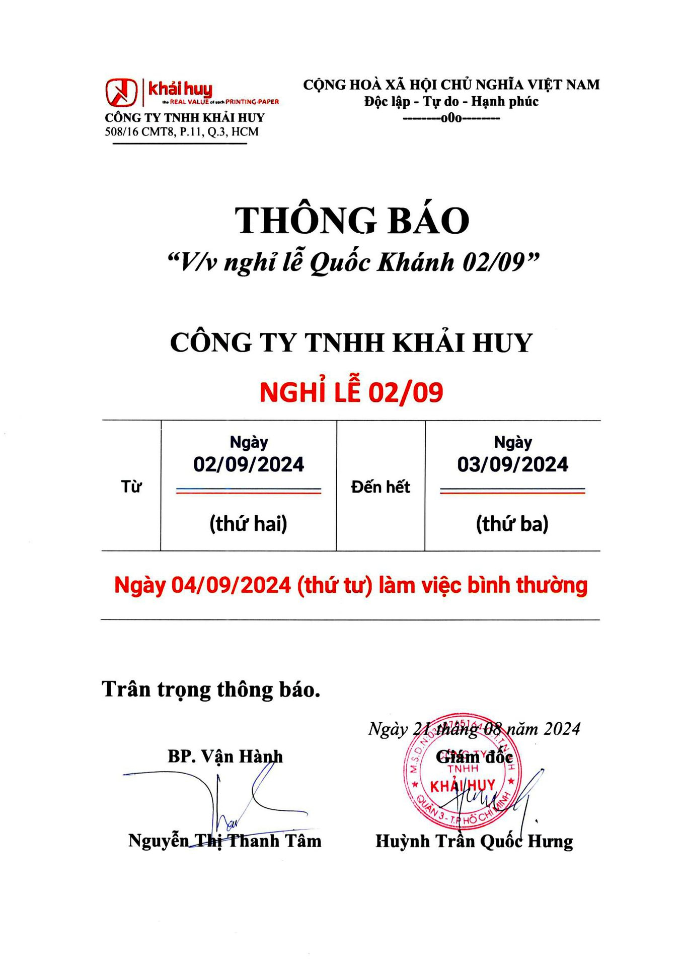 THÔNG BÁO NGHỈ LỄ QUỐC KHÁNH 2/9