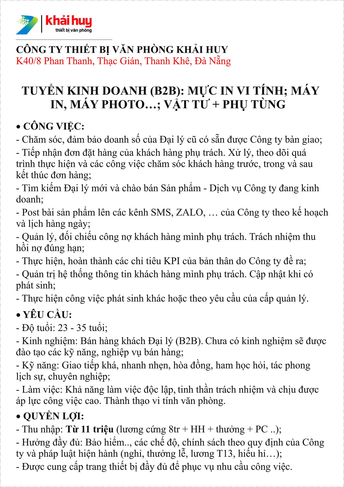 TUYỂN KINH DOANH (B2B): MỰC IN VI TÍNH; MÁY IN, MÁY PHOTO...; VẬT TƯ + PHỤ TÙNG (CHI NHÁNH ĐÀ NẴNG)