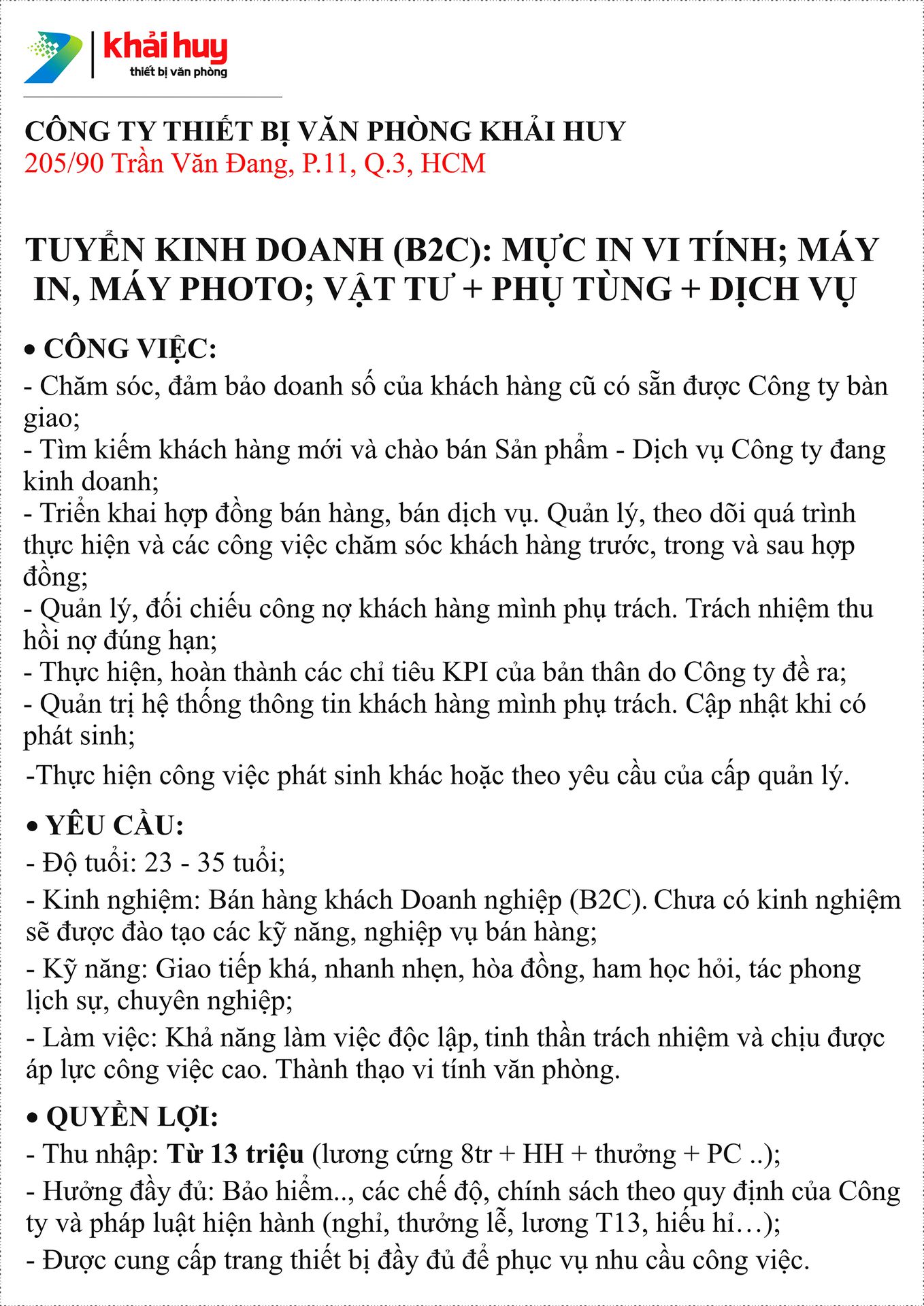 TUYỂN SALE ADMIN (B2B): MỰC IN VI TÍNH; MÁY IN, MÁY PHOTO...VẬT TƯ + PHỤ TÙNG